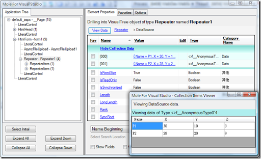 從 Visual Studio 2005 以來有個非常好用的功能, 就是在 debug 的時候, 可以用Visualizer 很方便的針對某些類型的變數進行觀察, 比如說 Text Visualizer, XML Visualizer, HTML Visualizer 等等, VS2008 還針對了 IEnumerable 物件也提供了檢視的能力(這麼做會針對該集合物件 enumerate 一次, 所以如果想要檢視集合物件的內容, 要先確認該集合是不會因為被列舉過而有所改變, 否則會發生預期之外的結果), 網路上還有其他人也針對 Visual Studio 寫了一些 Visualizer, 像是 Mole 這個 Visualizer 就超強大, 不論是 ASP.NET, Windows Forms, WPF 都提供了很多好用的 Visualizer, 只能說超好用!!